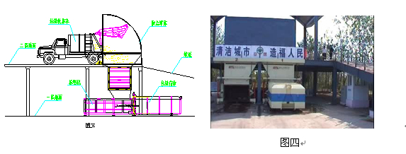 2、壓縮機(jī)固定在地面上,車輛傾倒垃圾在二層樓上(如圖三)。