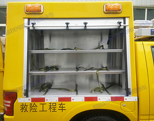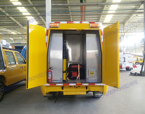 此款車全金屬框架式封閉結構,兩側卷簾門、后部雙開門,廂內分為3個部分,兩側存放救險工具、中間放置汽油發電機組,機組可從后門拉出。
